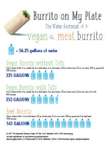 The Vegetarian Resource Group has a graphic called Burrito on My Plate, which shows viewers the water footprint of a vegan versus a meat-based burrito. It takes 225 gallons of water to make a vegan burrito without tofu and 253 gallons of water to make a vegan burrito with tofu. In comparison, it takes 541 gallons of water to make a beef burrito.