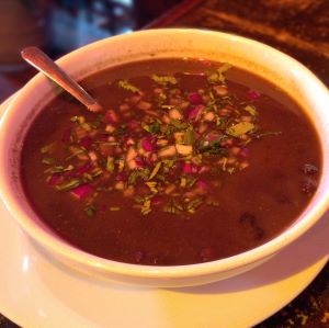 - Vegan Black Bean Soup topped with cilantro and chopped red onion.