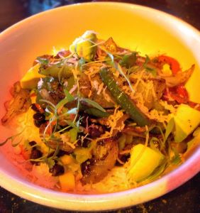 - Jerk Veggie Bowl: Grilled jerk marinated veggies with a mango black bean salsa and diced avocado. Served over coconut rice.
