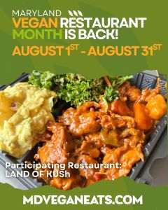 Maryland Vegan Restaurant Month runs August 1st through 31st, 2025. Be sure to try out all the restaurants participating this month including Harmony Bakery, Johnny Rads, Land of Kush, Oleum, and Roland Park Bagels in Baltimore City, plus many other establishments.
