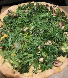 April’s pizza featured spring vegetables – sugar snap peas, broccolini, and arugula, along with sautéed mushrooms and shredded vegan cheese. The sauce was a lemon crème cashew sauce.