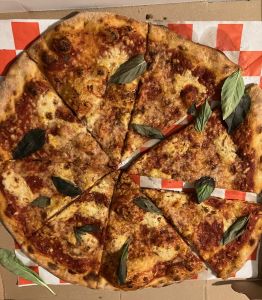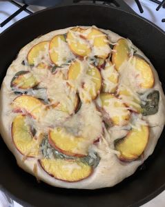 In August, the pizza celebrated local peaches with a topping of sliced peaches, fresh basil, and vegan Mozzarella shreds all baked in a cast iron skillet.