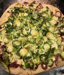 The year ended with December’s pizza – a homemade vegan cheese sauce, balsamic vinegar-caramelized red onions, shredded Brussels sprouts, and vegan Parmesan shreds.