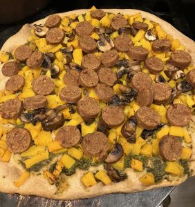 February’s pizza was topped with pesto from the freezer, sun-dried tomatoes, sautéed cremini mushrooms, roasted butternut squash, and slices of sautéed vegan Italian sausage.