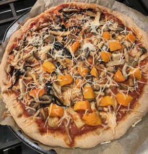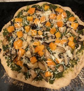 In January, I made 2 pizzas. One was topped with homemade pesto from the freezer and the other with commercial red sauce. Both featured a mix of sautéed mushrooms (shiitake, king trumpet, black trumpet, hedgehog, tree oyster, and lion’s mane) sautéed in a little olive oil, roasted butternut squash, and shredded Italian blend vegan cheese.