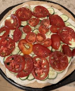With July and hot weather, the pizza crust was prebaked and then topped with vegan sour cream (made with silken tofu, dill, and parsley), sliced cucumbers, sliced tomatoes, and capers.