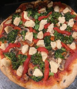 In March, the pizza consisted of a commercial red sauce, steamed broccolini, roasted red pepper, sautéed baby Bella mushrooms, and homemade vegan cashew Mozzarella cheese.