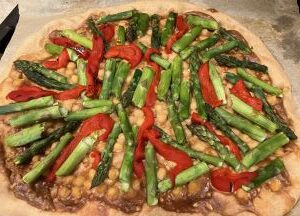 May’s pizza spotlighted fresh local asparagus, lightly steamed and used to top a pizza dough spread with peanut sauce. Chickpeas and red pepper slices also made an appearance.