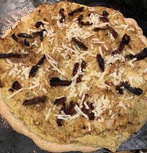 October’s pizza had a white bean spread made with white beans, fresh dill, and tahini. It was topped with sautéed cabbage and onions, sun-dried tomatoes, and vegan Mozzarella shreds.