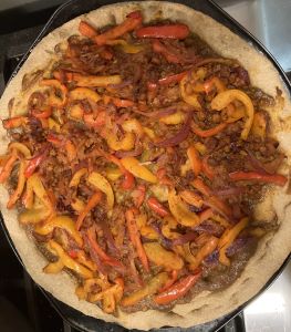 For September, the pizza crust was made with a mixture of all-purpose flour, whole-wheat flour, and cornmeal. It was topped with a cilantro/tomato sauce, sautéed peppers and red onions, and vegan chorizo.